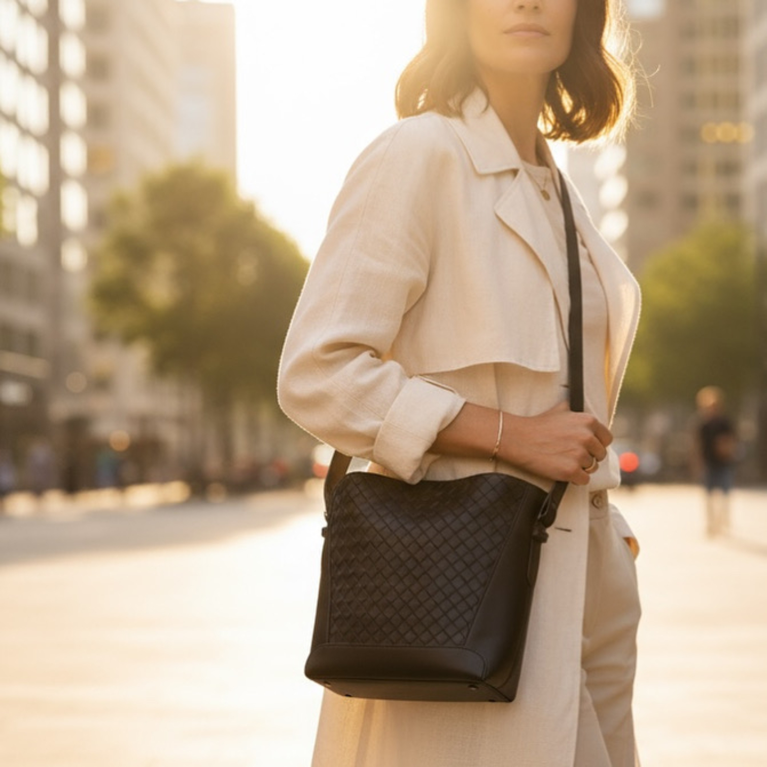 The woven whisper medium Bucket Bag.